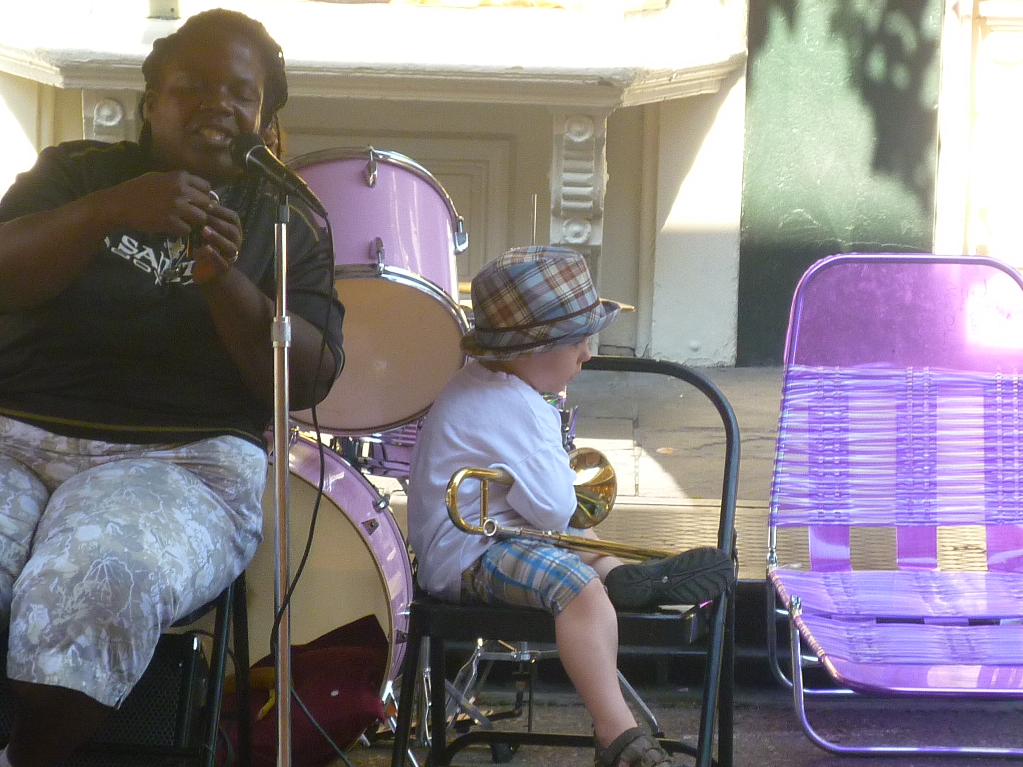On our first morning in the French Quarter, we happened on this curious quartet: a soulful African-American woman singing and playing clarinet, what looked like her daughter, aged about eight, on a pink drum set, a fabulous guy on rhythm tuba behind, and this odd little white kid hanging around with a trumpet. He didn’t play while we were there, but once did a sort of shuffle towards the spectators. She sang and then went into what seemed like effortlessly soaring clarinet – listen to it here. And that was just Day One!