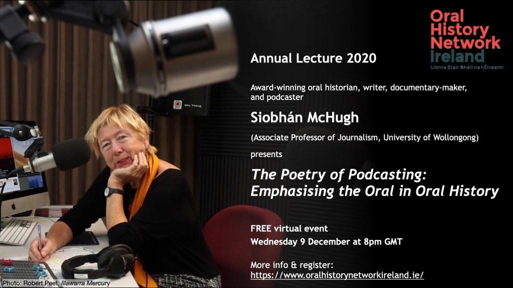 This is a talk I gave in December 2020 for the Oral History Network of Ireland annual lecture. I discuss how to turn interviews into an audio story and how to use music and ambient sound to build a narrative. There’s a live demo (starts 37.01) of converting a ‘raw’ interview to a story, using music and chickens (!) to add mood and pace. For readers of my book, The Power of Podcasting: this is the interview with entertainer Ingrid Hart I describe in the Prologue!