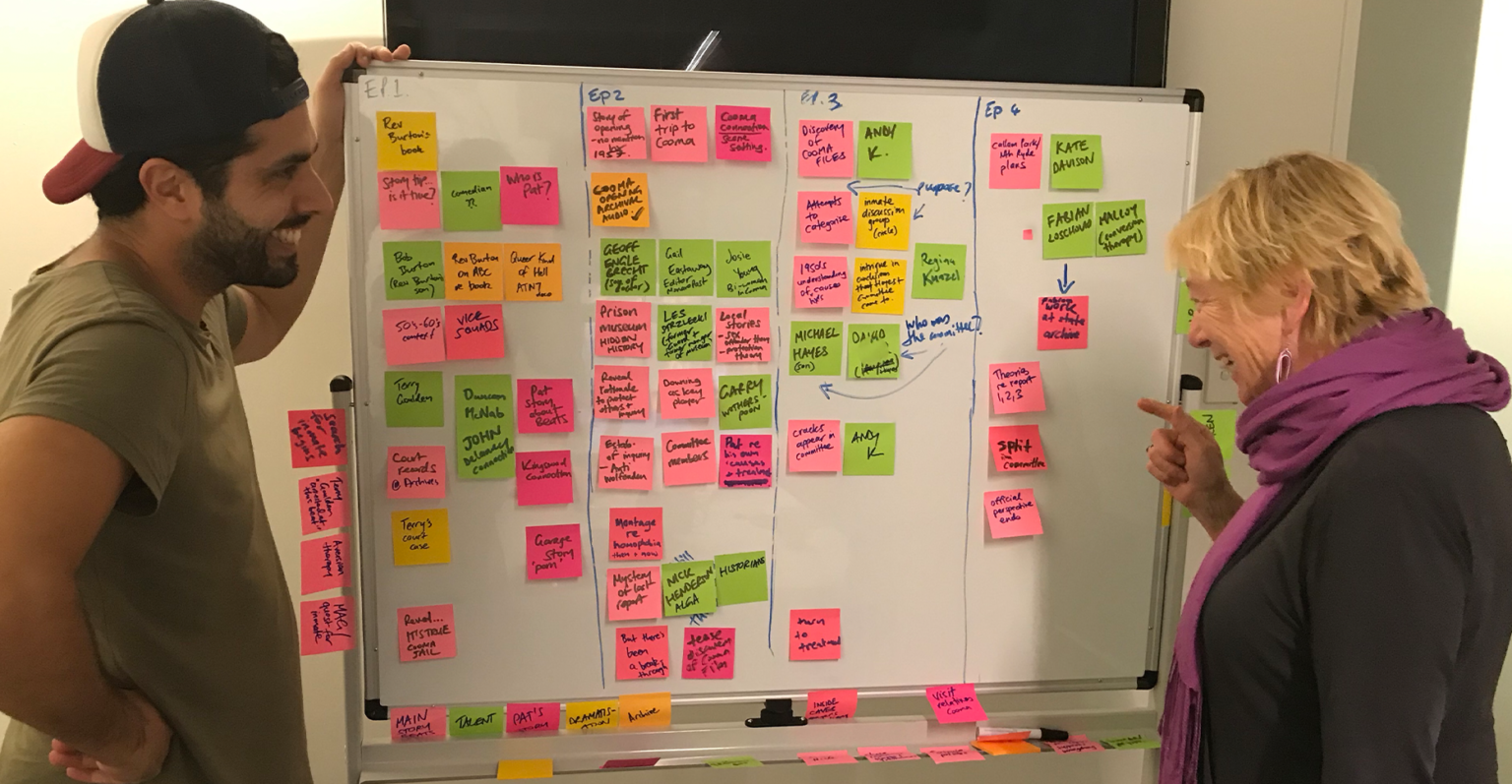Siobhán McHugh with host and co-creator Patrick Abboud at an early production meeting for The Greatest Menace. The post-it notes are colour-coded for narrative elements. The Greatest Menace has won/been a finalist in eleven awards.