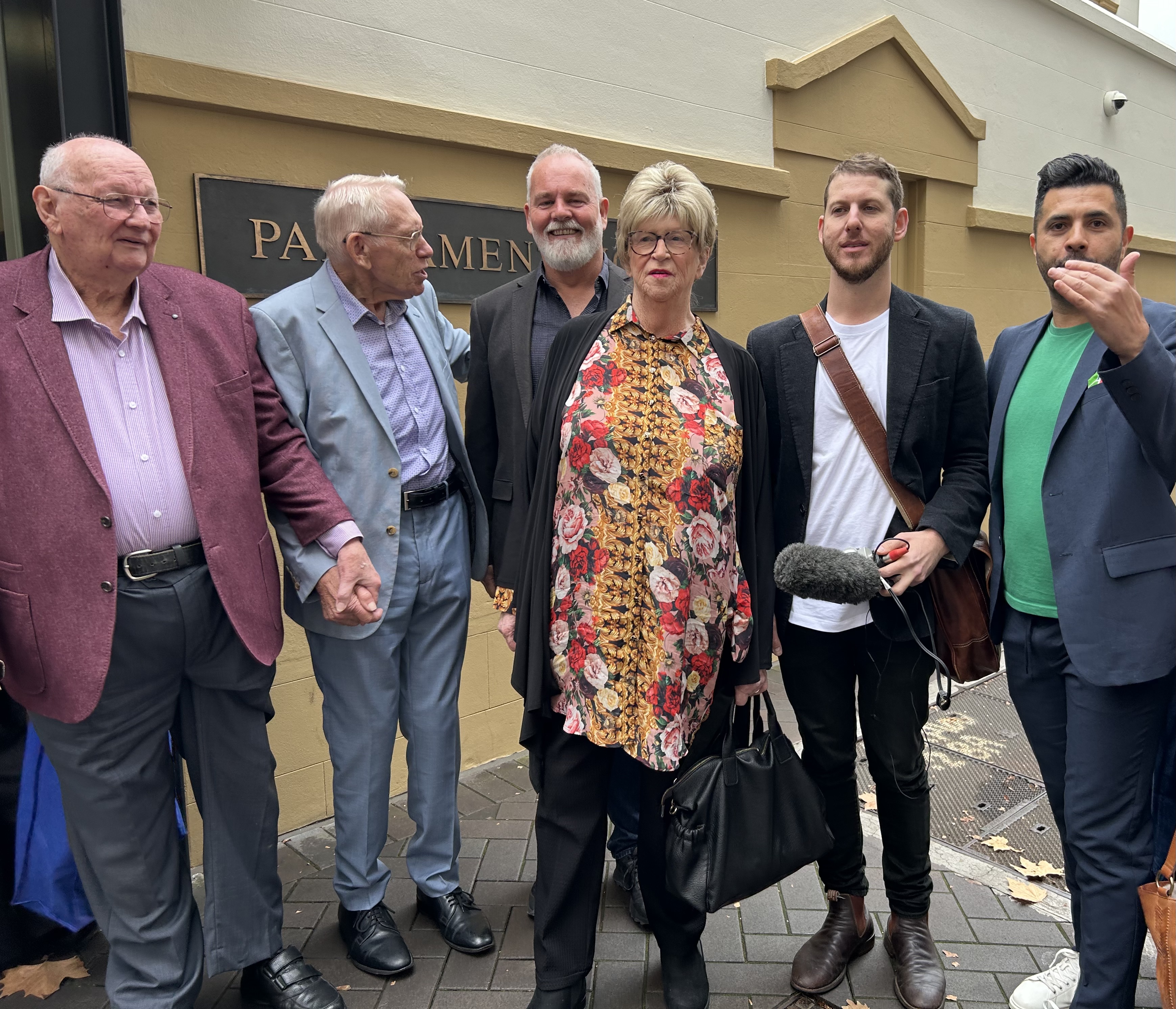 Outside Parliament House, Sydney, 6 June 2024, before the apology. From left, Terry Goulden and his husband John Greenway; Paul Horan, executive producer, Audible; Jacquie Grant; Simon Cunich; Pat Abboud, beckoning to Siobhán McHugh to join the photo rather than take it.
