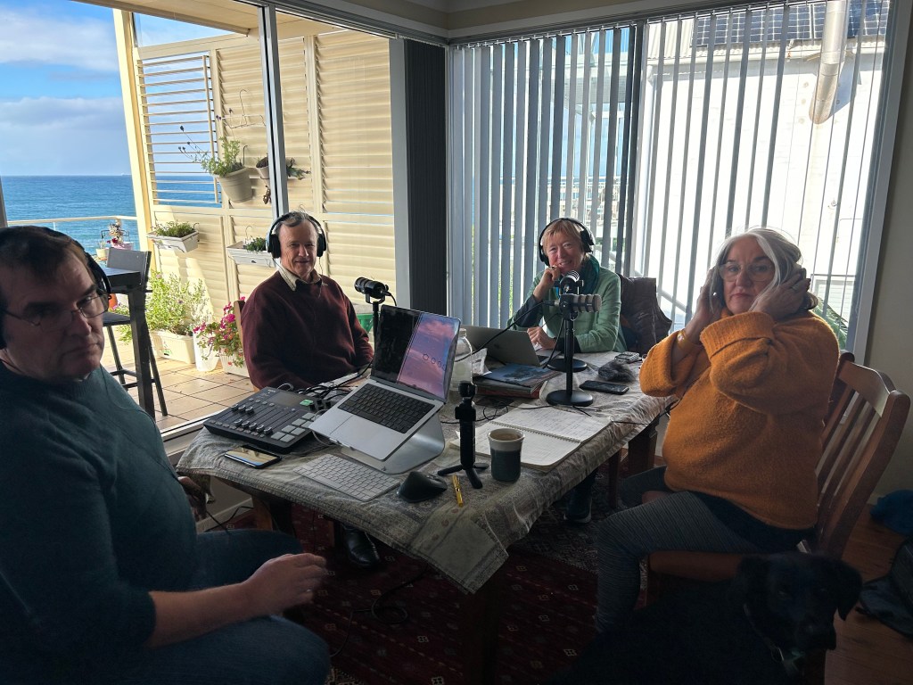 Team from Heart of Artness podcast preparing for S2: Guy Freer, technical producer; Ian McLean, art historian; me and Margo Neale, co-hosts.