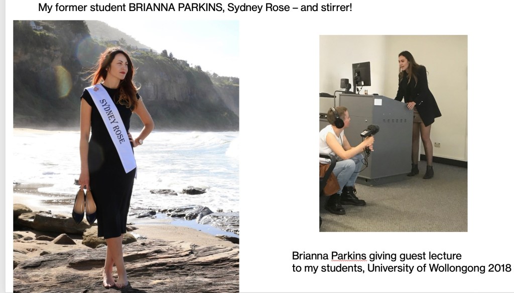 I’m teaching Journalism at the University of Wollongong, where I have a promising student called Brianna Parkins. Bri and I bonded in a kind of tough love way over journalism, feminism and Irishness. She was edgy and fun – and pretty radical.