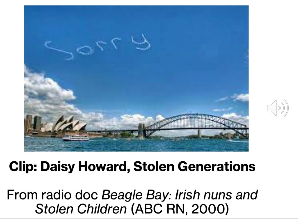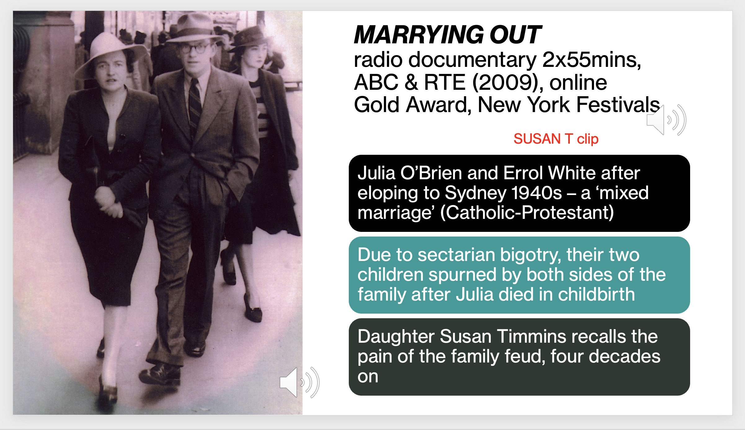 Video of talk (50mins) is HERE. It contains lots of illustrative audio clips from three of my projects: the podcast Heart of Artness, about cross-cultural relationships behind the production of contemporary Australian Aboriginal art; the radio documentary series Marrying Out, about sectarianism and bigotry in Australia; and the radio documentary series Minefields and Miniskirts, about Australian women’s role in the Vietnam war.