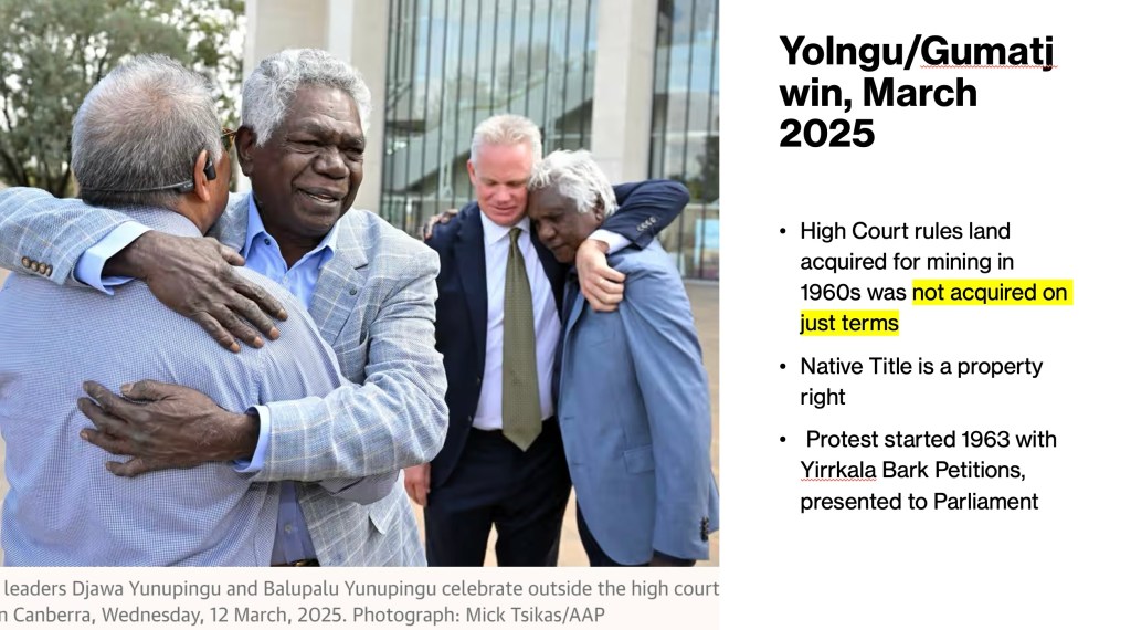 The country we drove through belonged to the Yunipingu family of the Gumatj clan – a famous family, known for the band Yothu Yindu and more. In 2019 the late Dr Yunipingu launched a Native Title case against encroachments by bauxite mines dating back to the ‘60s. In fact the Yolngu had protested the mines as far back as 1963, via two extraordinary bark petitions presented to Parliament in Canberra. Dr Yunipingu died two years ago. But just LAST WEEK, his brothers won a huge victory in the High Court on his behalf. It ruled that the Yolngu land had not been acquired ON JUST TERMS and that the community was owed substantial compensation. It’s as big a legal win as Mabo or Wik.